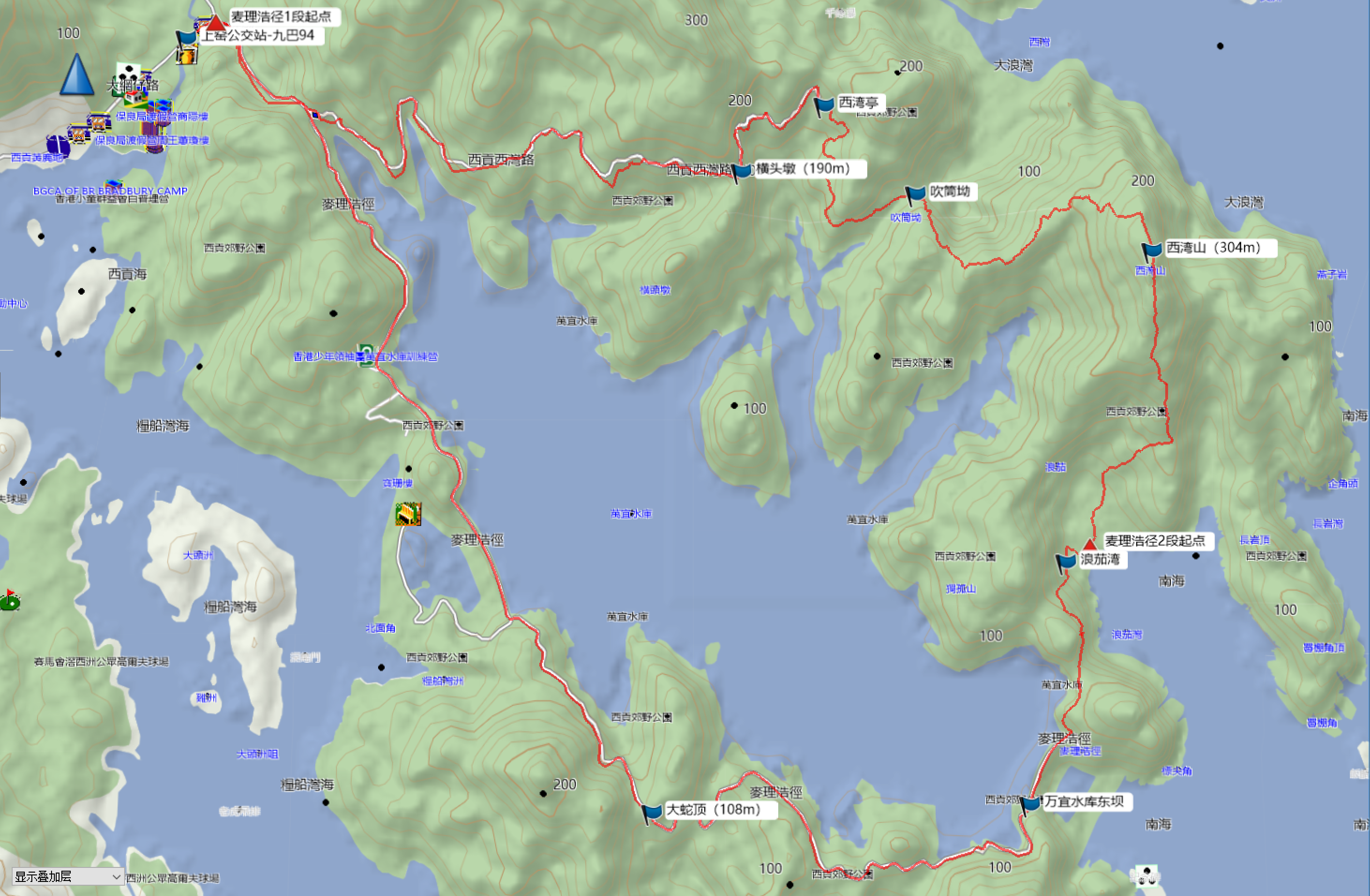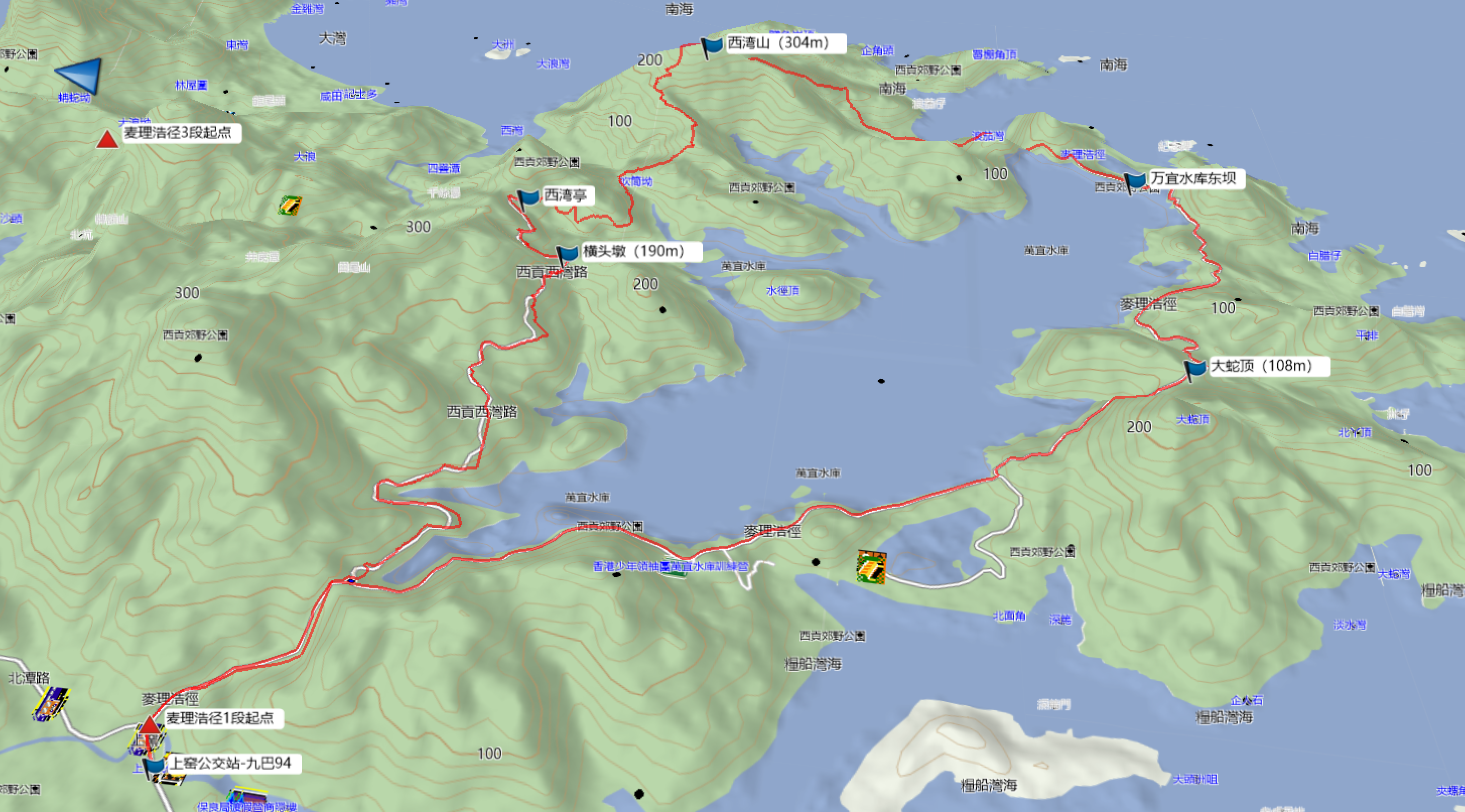 【线路分析】 从上窑公交站起点开始到万宜水库环线终点水库东坝,均为水泥道路,长度为9公里,上下坡幅度不超过50米。过东坝开始进入山路,2公里下山路抵达全程海拔最低点浪茄湾沙滩,看无敌沙滩美景。从浪茄湾走2公里上山路爬高300米抵达西湾山顶风雨亭,这段是全程最难走的一段了。从西湾山顶开始下山,走2公里多轻松下山路下降230米抵达分路点吹筒坳,这里继续往北就是麦径2段的路线,也可以往东去大浪湾的西湾村喝茶看海景,而我们则往西走麦径下撤路线前往西湾亭。吹筒坳到西湾亭1.5公里,小幅上升60米。西湾亭开始回到起点北谭涌6公里,全程水泥乡道。西湾亭有29R路村巴到北谭涌,可以作为下撤备用,也有出租车可以打车,省下最后6公里脚程。整体来说,这个路线长度22.5公里不算太远,主要是累计900米的爬高,但由于900米高度多数被分散在小幅度的起起伏伏中,极大的缓解了爬高的难度,多数队员都能完成。