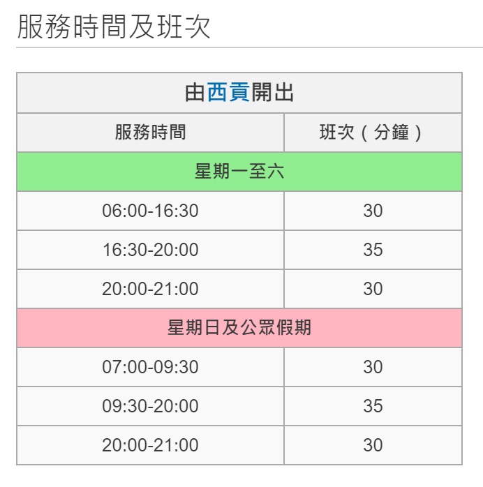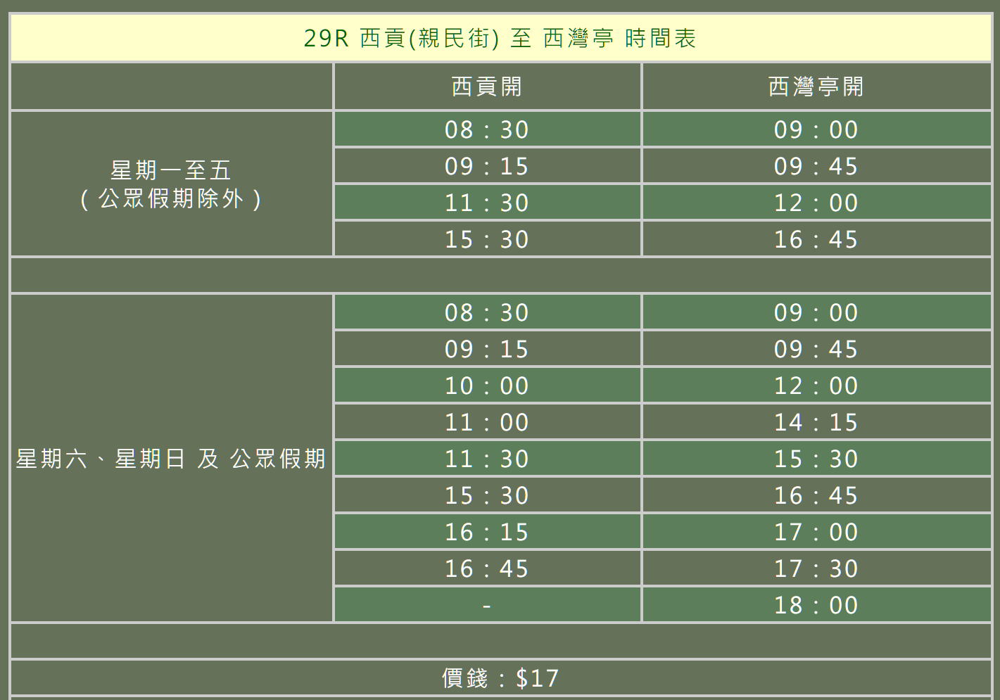 【分组行程】 考虑到大家不同的体能,按照健行者常规分开两个小组,全程组和后勤休闲组。后勤休闲组采取逆环路线与全程组相向而行,然后在吹筒坳分路点向东下大浪湾沙滩进入西湾村休息。西湾村是一个有居民的村子,可以在这里沙滩边的小店买一杯咖啡,看岁月静好……中午可以要一份豆腐花尝尝。大约下午2点半左右返回吹筒坳与全程队员会合往西湾亭公交站,可以选择徒步6公里或者乘下午3点半的29R村巴(注意村巴班次有限,见下表)返回起点。这样休闲路线往返全程也有14公里比较适中,乘车的话只有8公里了。
