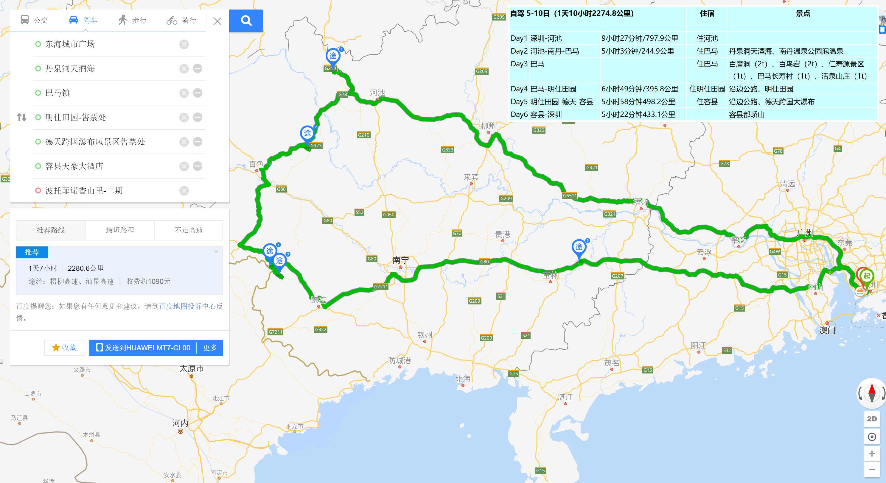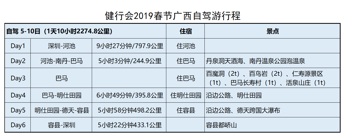 具体行程安排为:去程2月5日早上出发,走北二环上广梧高速到河池入住;回程2月9日从德天走广昆高速到容县入住,10日自容县到深圳(回程根据当时路况或有调整)。全程除第一天到河池路程较长外,其他单日驾车均不超过5、6小时左右,属于比较休闲的行程。
