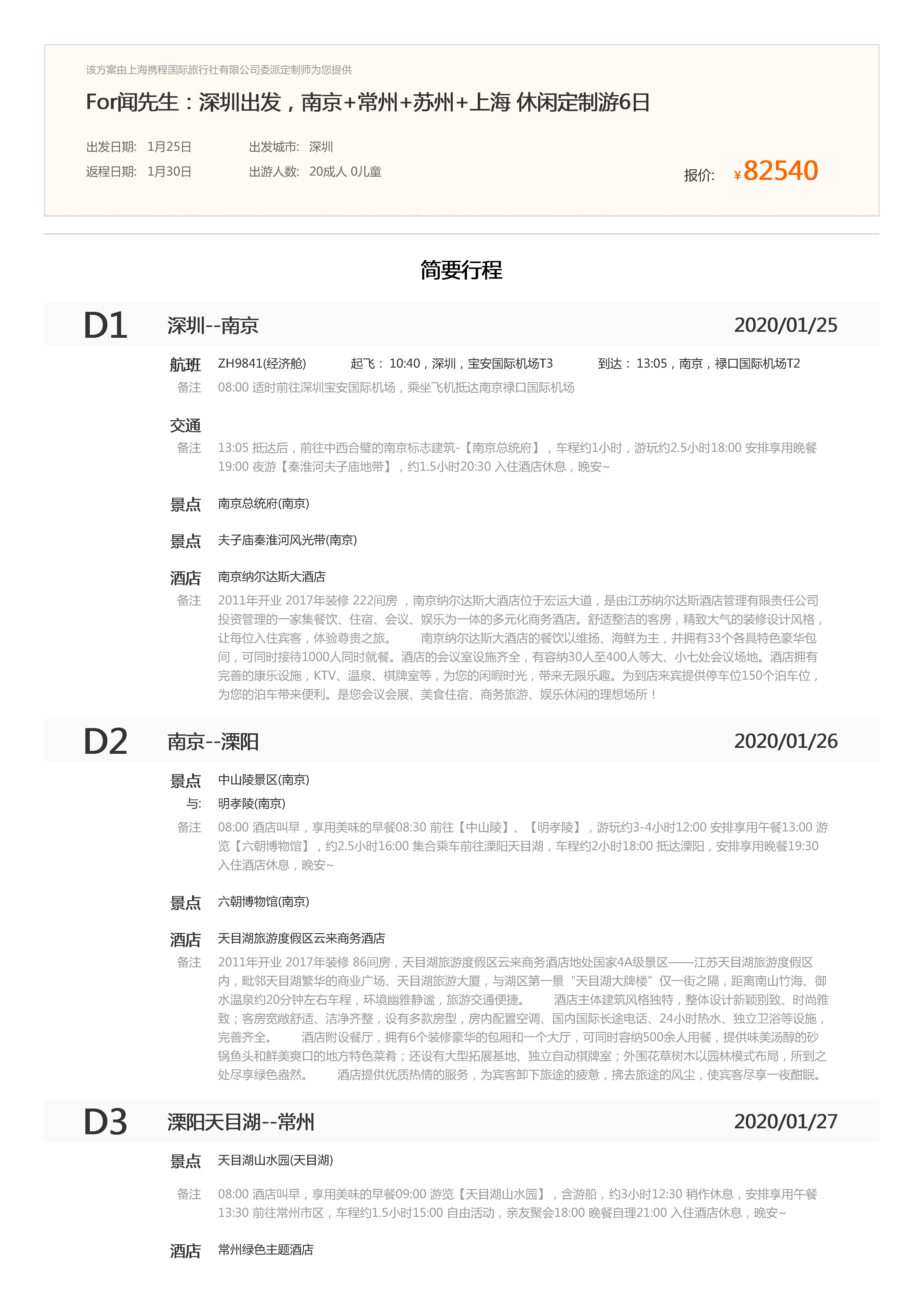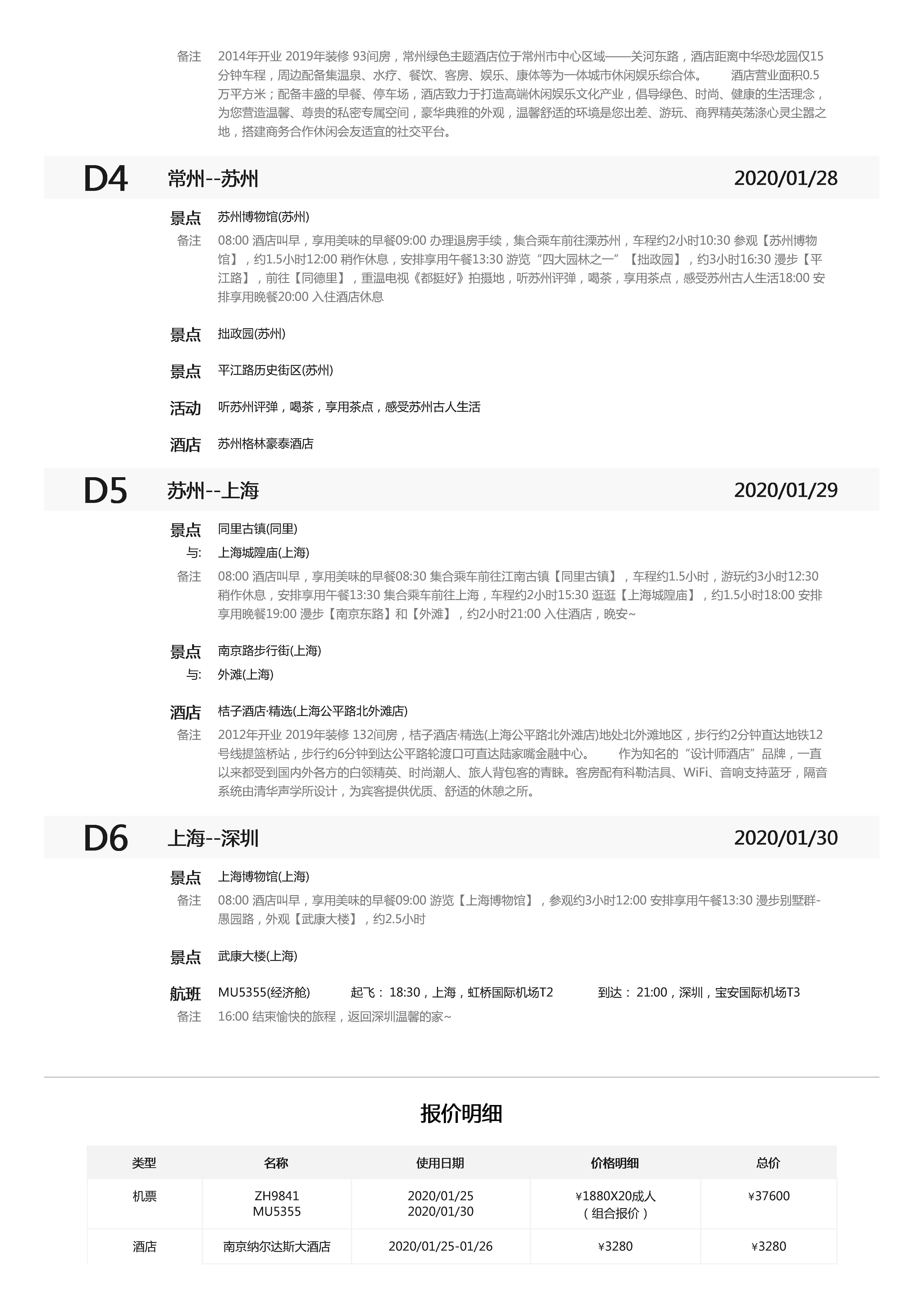 常住珠三角,未识长三角,这个春节我们走走江南、看看长三角!本次活动通过携程定制旅行招标、根据我们的需求制定行程、安排资源(机票、用车、酒店和门票等),经雪人协助在3个旅行社中评比优选。目前已经基本敲定行程,正在比较细节确定最终花落谁家。全程包车+司机+导游,大致行程如下: