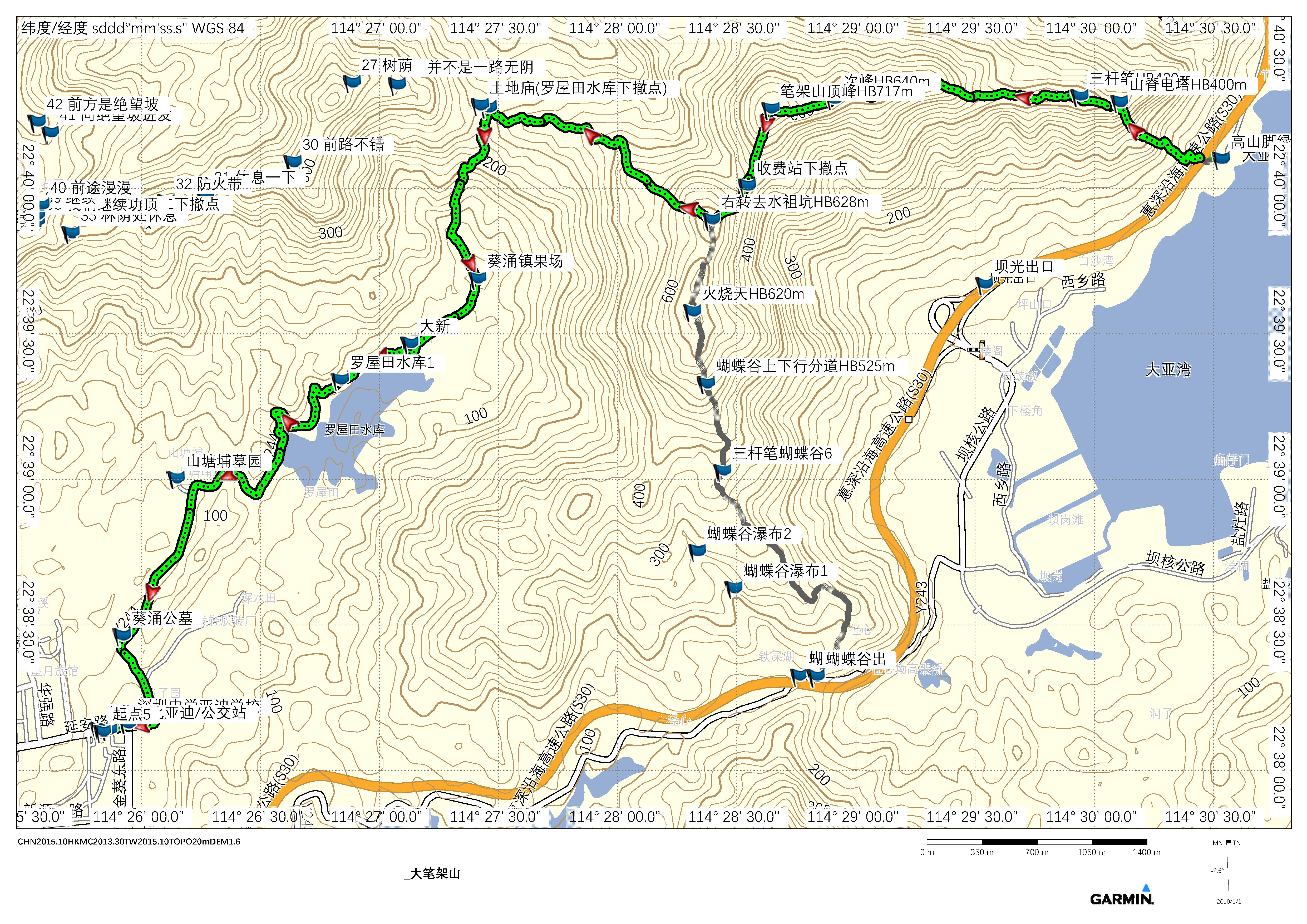 周六车停小桂(沿海高速小桂出口),穿越分队从小桂上山,休闲分队走小桂绿道,也可反向走大亚湾绿道(小桂-澳头)。休闲分队也可先与穿越分队一同上大笔架山,适时返回。穿越分队在登顶大笔架山主峰后,走土地庙下撤路线下山,下午4:30左右抵达葵涌隧道口(葵湾路-罗屋田路口),后勤来车接应到小桂会合,大约下午5:30在健行者定点阿坚海鲜坊晚餐FB后返回。