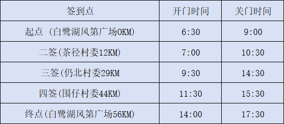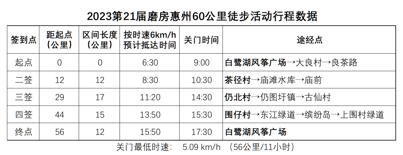 - 本次徒步全程56公里,关门时间11个小时(含休息和用餐时间),关门前完成全程的最低平均时速为5.09公里/小时,还是比较有挑战的,请大家做好权衡。